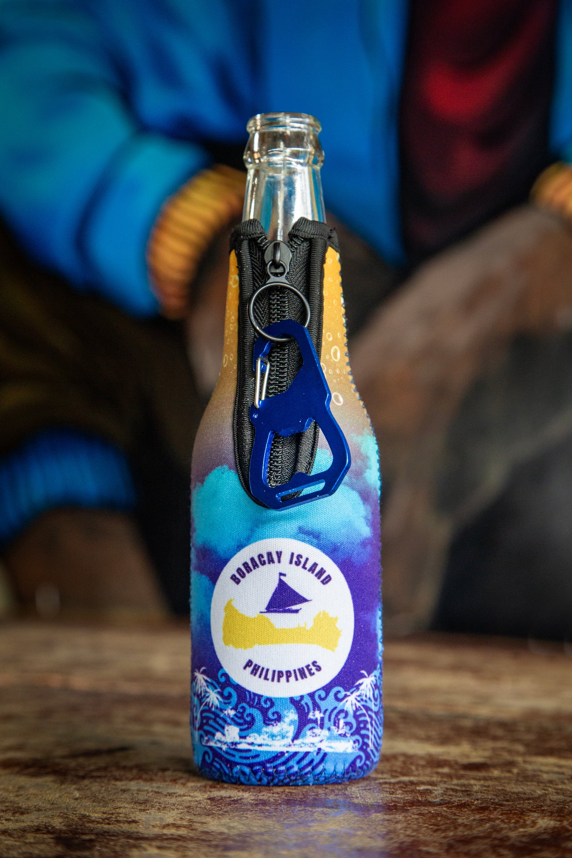 Each sleeve features an exclusive tropical design inspired by the laid-back spirit of Boracay and comes equipped with a blue metal carabiner that includes a built-in bottle opener for added convenience. Attach it easily to your bag or cooler so you're always ready to relax and refresh.